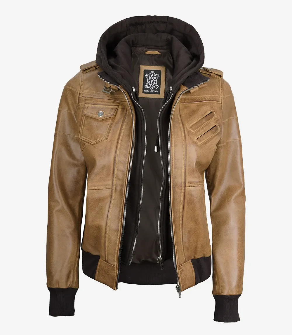 Camel Brown Hooded Bomber Leather Jacket