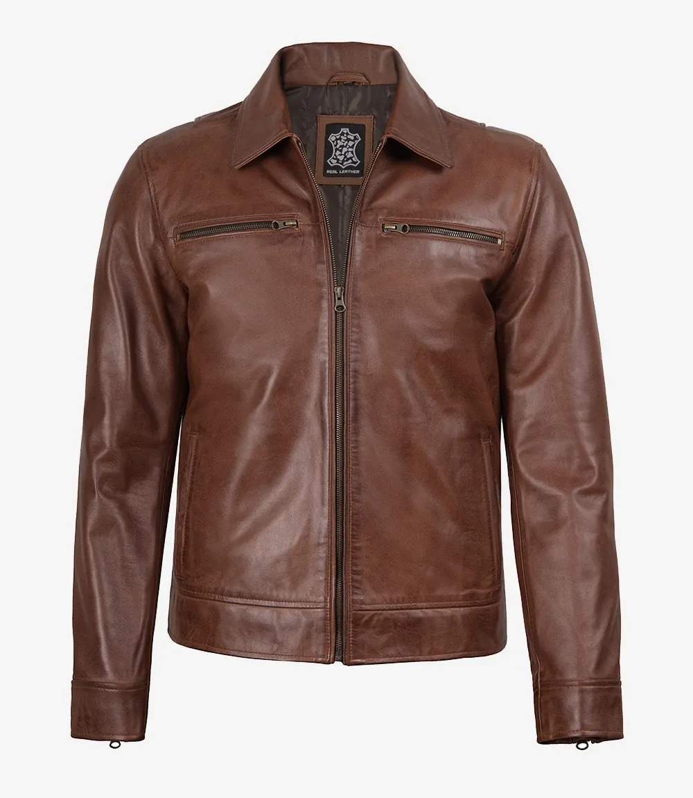 Classic Shirt Collar Cognac Leather Jacket