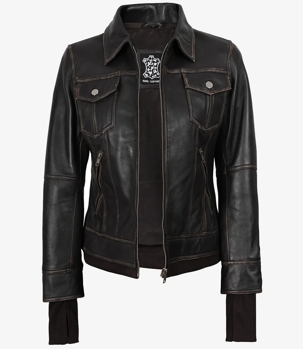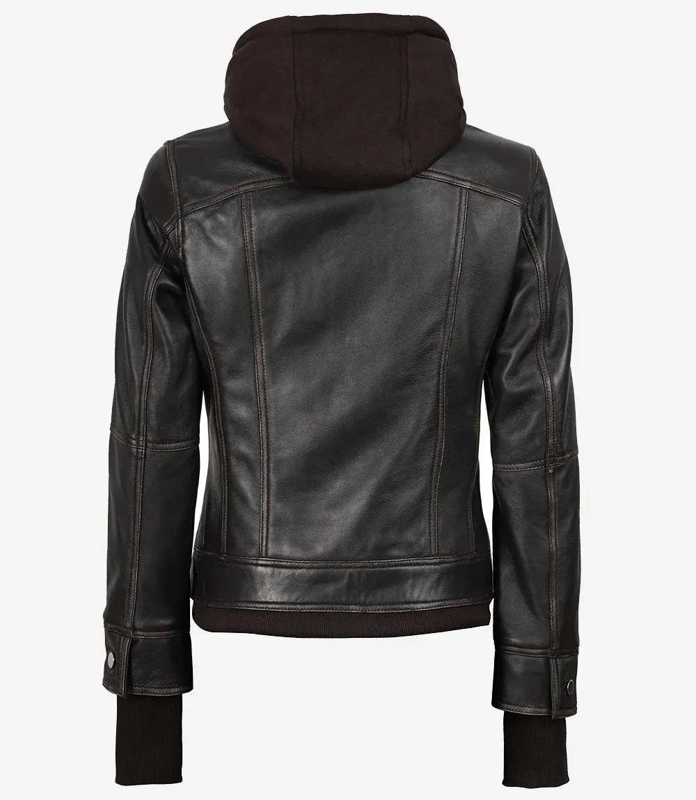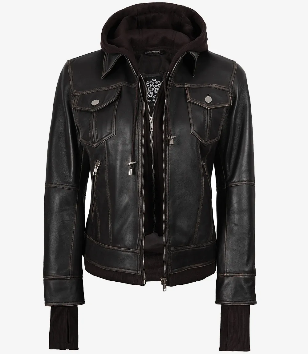 Distressed Brown Bomber Leather Jacket with Removable Hood