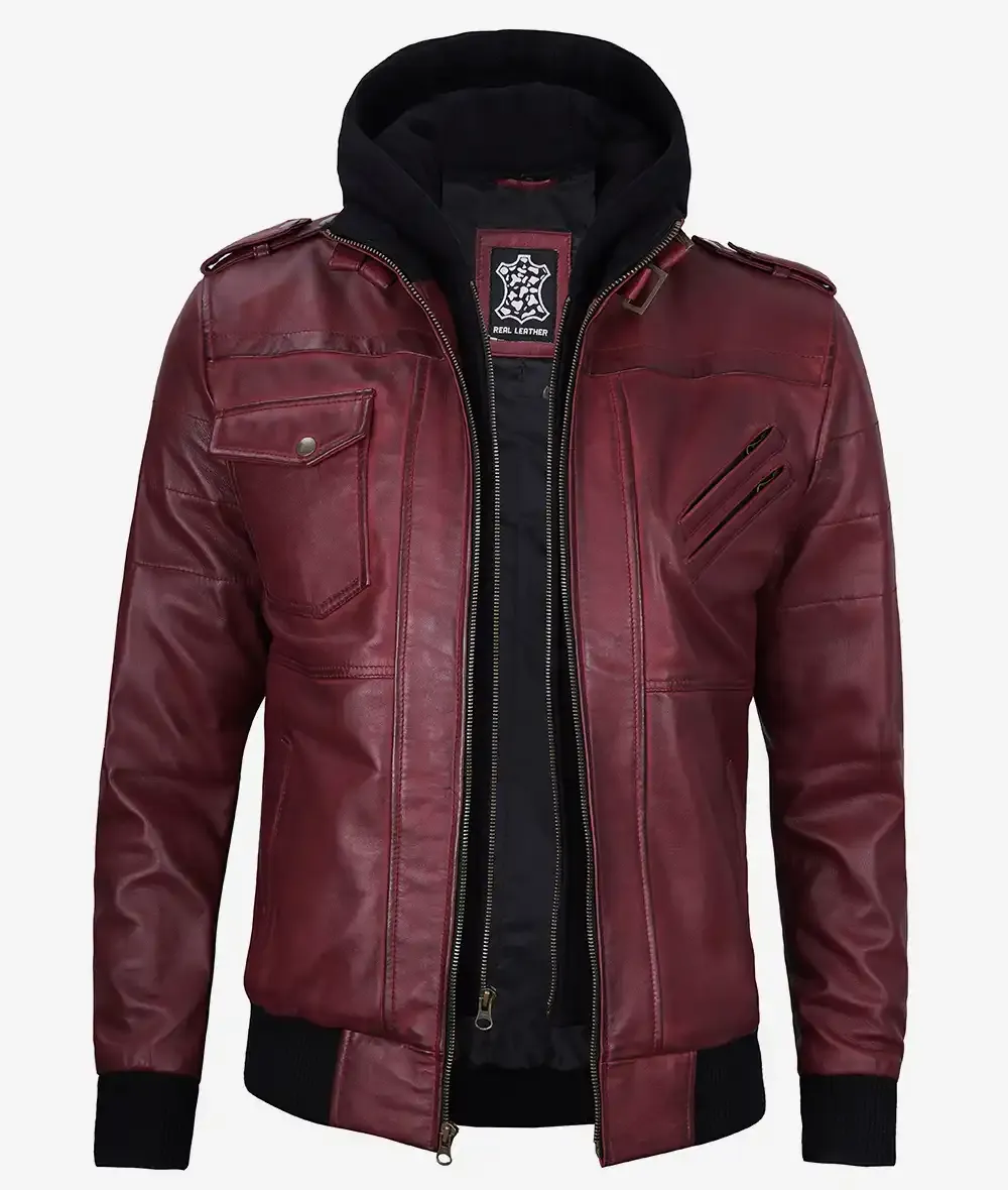Men Maroon Bomber Leather Jacket With Removable Hood