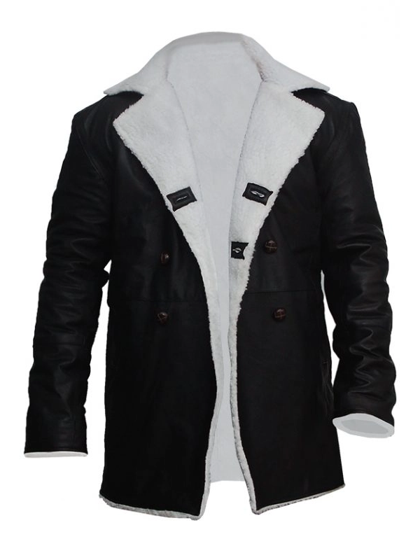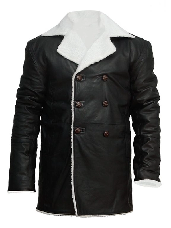 Mens Black Leather Long Shearling Coat with Fur Collar