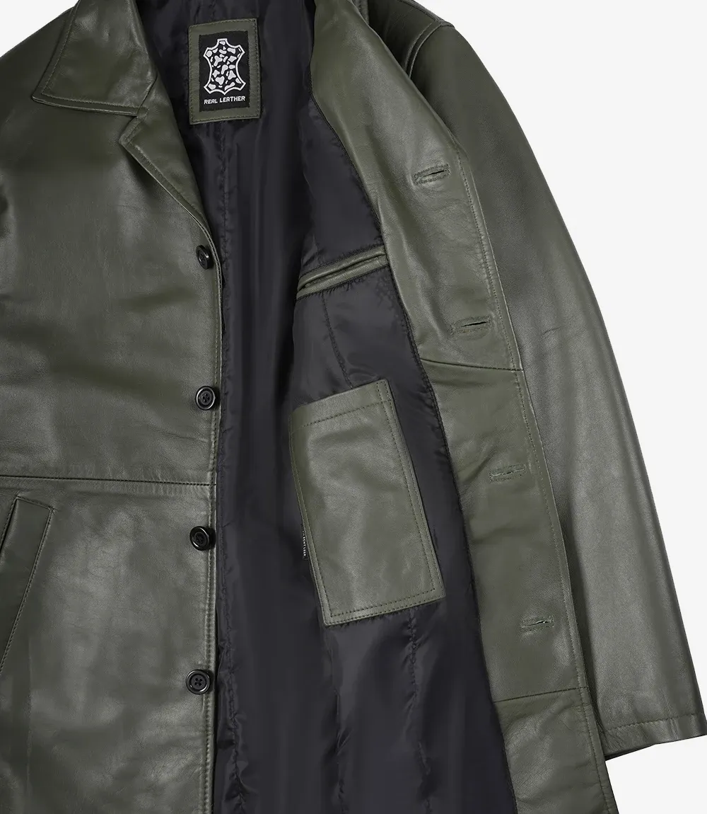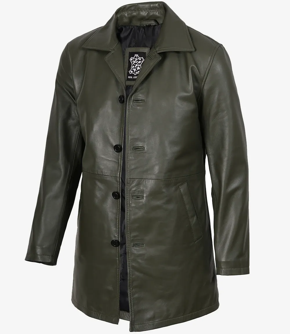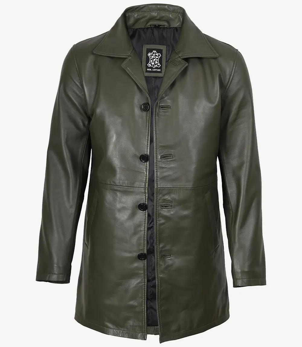 Olive Green 3/4 Length Leather Car Coat