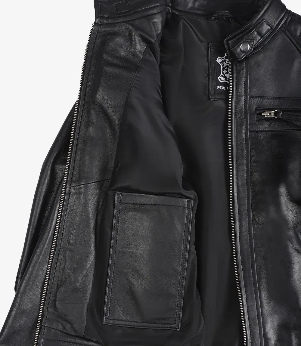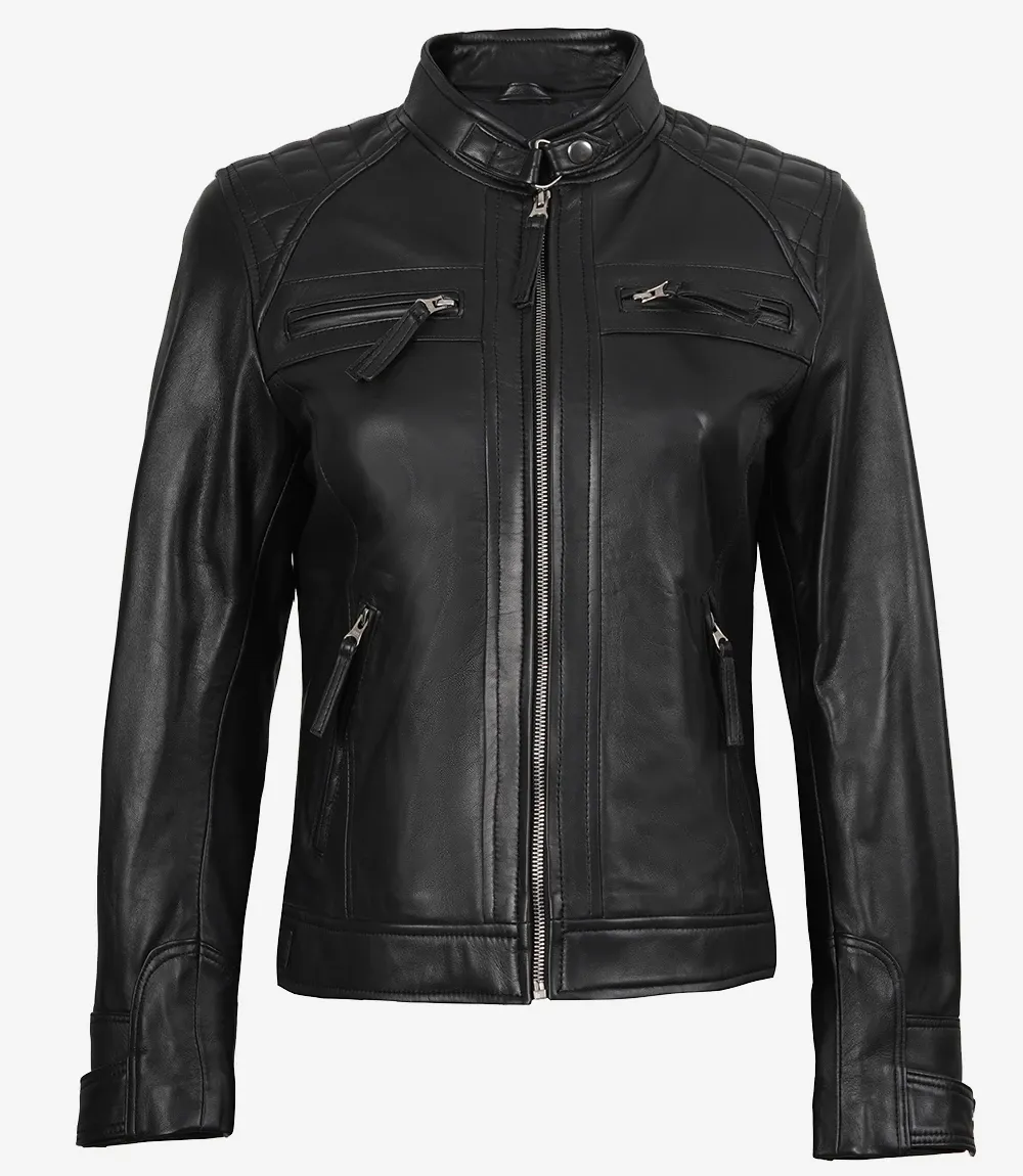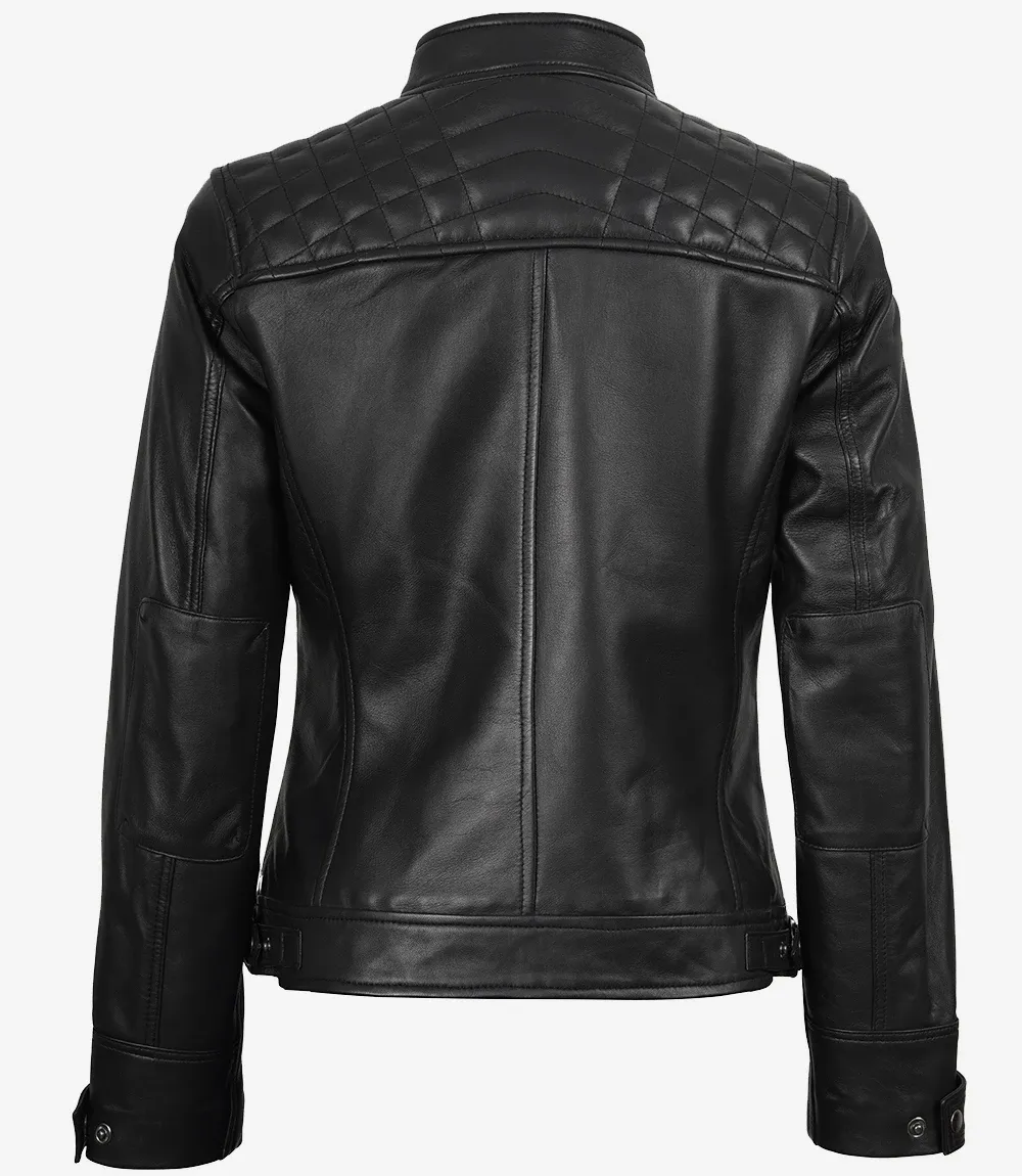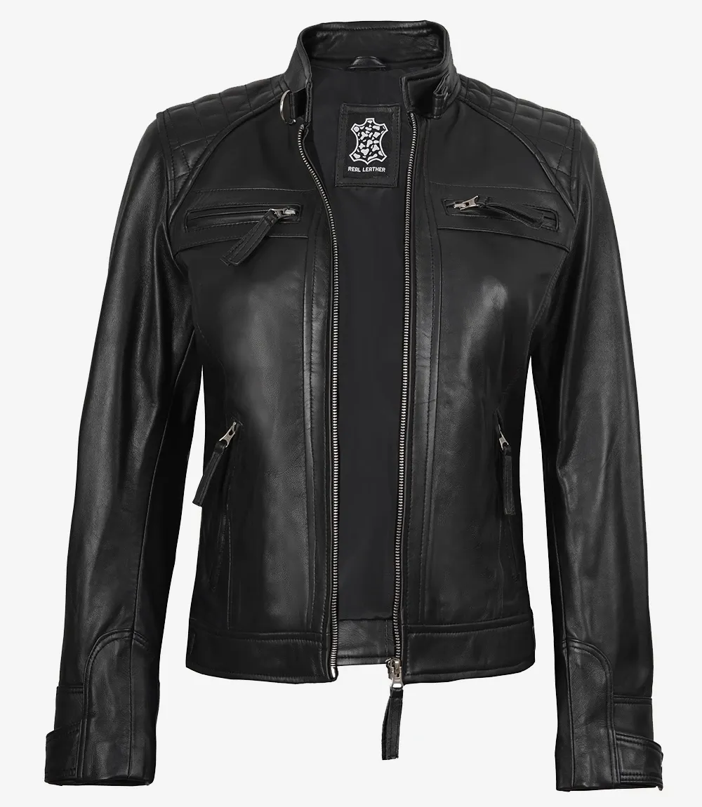 Women Black Leather Biker Style Jacket – Quilted Shoulder